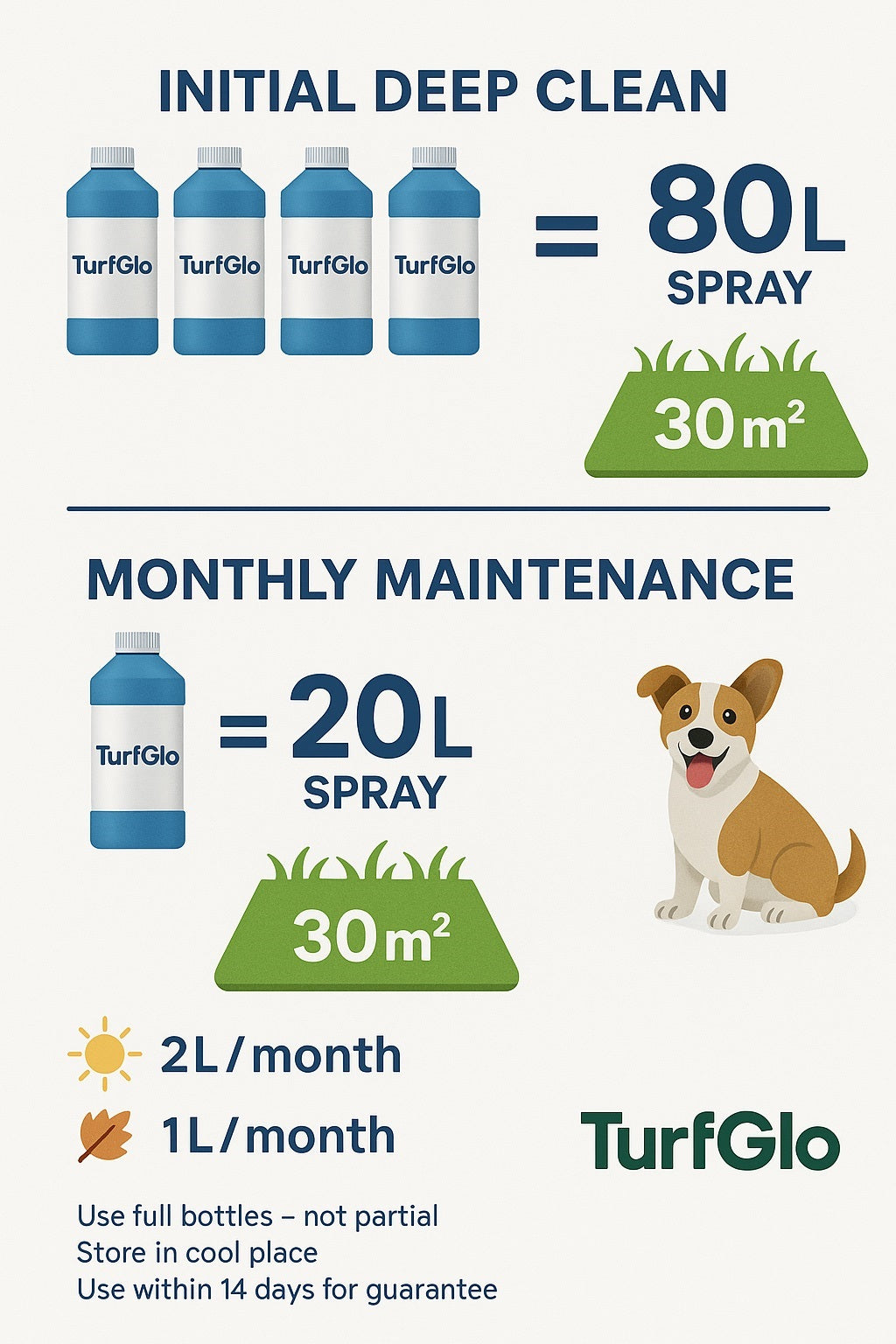 Use 1 × 1L bottle (diluted) = 20L spray, covering 30m² - Summer: 2L per month